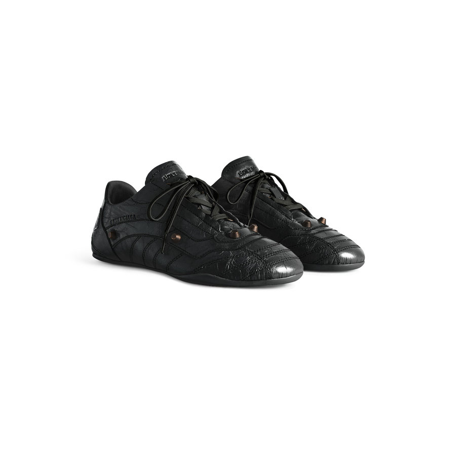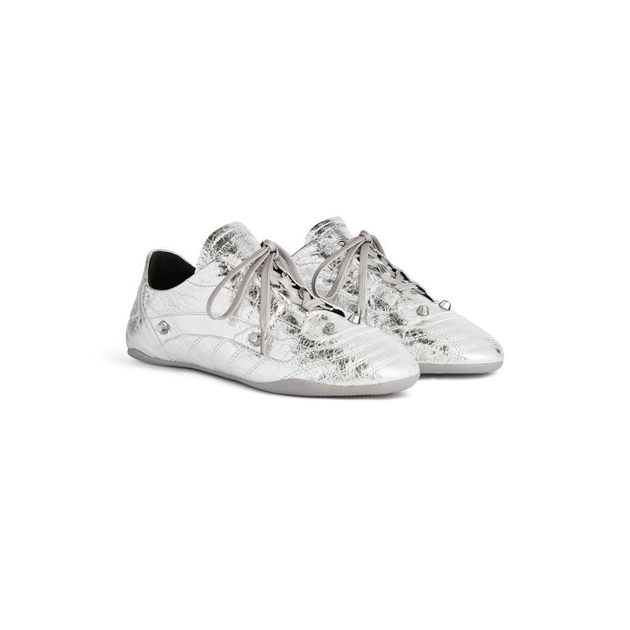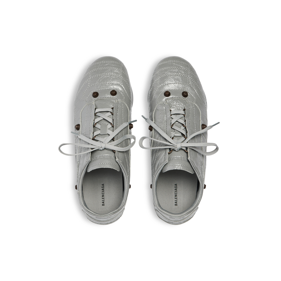 สนีกเกอร์ Balenciaga รุ่น City ประดับหมุดโลหะผสมสังกะสีทรงกรวยแบน ซึ่งเป็นการต่อยอดโดยตรงจากกระเป๋ารุ่น Le City รุ่นไอคอนิก โดยวางหมุดสองด้านฝั่งละสองหมุด และสองหมุดด้านหน้า สะท้อนดีไซน์แผงหน้าขนาดเล็กแบบสองหมุดของกระเป๋าได้อย่างลงตัว เชือกรองเท้าสีเดียวกับตัวรองเท้าและการเสริมด้วยการเย็บตะเข็บที่เน้นให้เห็นถึงเส้นสายที่โค้งมน