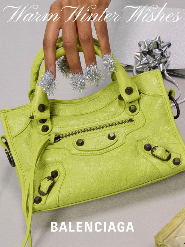 ปลายนิ้วที่ประดับด้วยกระเป๋าขนาดมินิและต้นสนขนาดจิ๋วเผยให้เห็นถึงความเรียบเนียนของหนังลูกวัวหรือประกายเพชรเทียมบนกระเป๋ารุ่น Rodeo ริบบิ้นสีเงินแบบสามมิติในลวดลายเล็บโดดเด่นเคียงคู่ความเงาวาวของรองเท้าส้นสูงรุ่น Avenue Pump ที่ทำจากหนังแก้ว เล็บลายสเวตเตอร์ ลูกกวาดคริสต์มาส และเส้นใยทินเซล ตัดกับผิวสัมผัสอันนุ่มนวลของกระเป๋ารุ่น Le City ทำจากหนังแกะอารีน่าหรือหนังกลับเคลือบแว็กซ์ ในส่วนของฮาร์ดแวร์หลากหลายแบบของรองเท้าบูตรุ่น Venom City ถูกเน้นให้โดดเด่นด้วยนิ้วเดียวที่ตกแต่งอักษรย่อ B