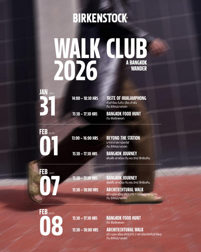 ในปี 2026 BIRKENSTOCK ประเทศไทย ต้องการเน้นย้ำและสะท้อนเจตนารมณ์ของแบรนด์ที่สนับสนุนทุกการก้าวเดิน จึงได้เปิดตัวกิจกรรม Walk Club เป็นครั้งแรกผ่านแคมเปญ BIRKENSTOCK WALK CLUB 2026 : A BANGKOK WANDER โดยเชิญชวนให้ผู้ที่สนใจด้านงานดีไซน์และชื่นชอบการเดิน ได้ออกไปสัมผัสประสบการณ์เพื่อค้นพบความเป็นไปได้ใหม่ๆ ของกรุงเทพฯ ผ่านการใส่รองเท้า BIRKENSTOCK มาร่วมออกเดินสำรวจเมืองไปด้วยกัน ณ เทศกาลงานออกแบบกรุงเทพฯ 2026 (Bangkok Design Week 2026) ซึ่งมีแนวคิดหลักครอบคลุม 3 องค์ประกอบได้แก่ อยู่ดี (City & Living) กินดี (Well-Being & Gastronomy) และธุรกิจสร้างสรรค์ (Creative Business) โดยครั้งนี้แบรนด์ได้ร่วมกับริทัศน์บางกอก (RTUS BANGKOK), ดร.วิทย์ สิทธิเวคิน และคุณภูณทัศน์ วิวัฒพัฒนอนันต์ (พีช อีทแหลก) รังสรรค์ทัวร์สำหรับสาย Food Hunt และสายรักการฟังเรื่องเล่า มาเสริมให้การเดินชมเมืองมีอรรถรสและเรื่องราวที่น่าสนใจยิ่งขึ้น ถือเป็นกิจกรรมหลักที่เปิดโอกาสให้ผู้เข้าร่วมได้เดินสำรวจกรุงเทพฯ ผ่านมุมมองใหม่ที่เต็มไปด้วยแรงบันดาลใจ โดยจัดขึ้นระหว่างวันที่ 31 มกราคม – 1 กุมภาพันธ์ และวันที่ 7-8 กุมภาพันธ์นี้ แบ่งโปรแกรมการเดินออกเป็น 8 รอบ ดังนี้