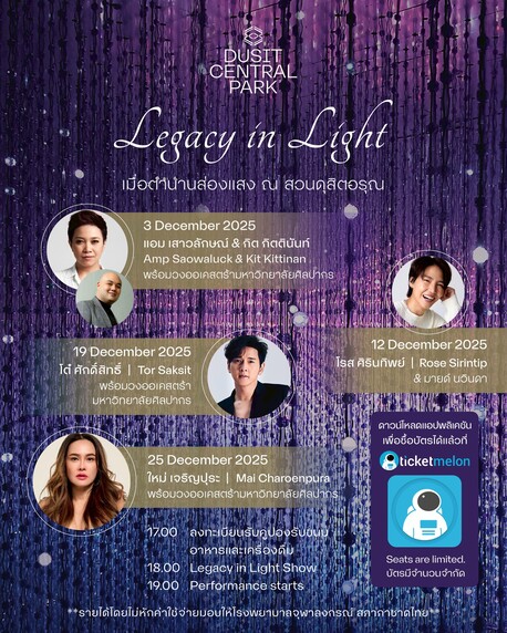Dusit Central Park โครงการมิกซ์ยูสระดับโลก ภายใต้คอนเซ็ปต์ Here for Bangkok และ The Residences at Dusit Central Park โครงการที่พักอาศัยระดับอัลตร้าลักชัวรี่ใน Super Core CBD ย่านพระราม 4 – สีลม ร่วมส่งท้ายปีงูเล็กท่ามกลางบรรยากาศธรรมชาติ กับงาน “Legacy in Light เมื่อตำนานส่องแสง” งานประดับไฟที่เชิญชวนให้ทุกคนเข้ามาสัมผัสความสวยงามของแสงไฟสุดตระการตาบนพื้นที่สวนดุสิตอรุณ ณ ดุสิต เซ็นทรัล พาร์ค สวนลอยฟ้าใจกลางเมืองที่ใหญ่ที่สุดในประเทศไทยขนาดใหญ่ 7 ไร่ ที่สร้างประสบการณ์ใหม่แก่ผู้มาเยือน ระหว่างวันที่ 3 ธันวาคม พ.ศ. 2568 ถึง 4 มกราคม พ.ศ. 2569 โดยมีไฮไลท์คือ Legacy in Light Show การแสดงประดับไฟนับล้านดวงทั่วทั้งสวน โชว์แสงสีและความสวยงาม ผสานเข้ากับแสงไฟยามค่ำคืนของใจกลางกรุงเทพฯ