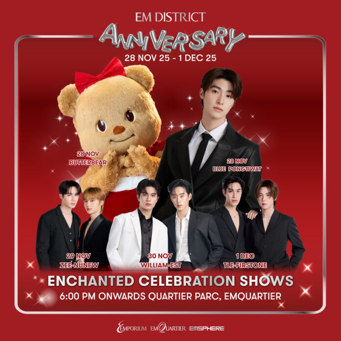 เอ็ม ดิสทริค (เอ็มโพเรียม, เอ็มควอเทียร์, เอ็มสเฟียร์) เฉลิมฉลองครบรอบ 2 ปีแห่งความสำเร็จในการเป็นย่านการค้าระดับโลกที่เติมเต็มความสมบูรณ์แบบของกรุงเทพมหานคร ด้วยอีเวนต์สุดยิ่งใหญ่ “EM DISTRICT ANNIVERSARY : UNSTOPPABLE HAPPINESS UNMISSABLE REWARDS พาทุกคนสัมผัสกับความสุขระดับลักชัวรีที่เต็มไปด้วยเซอร์ไพรส์และความพิเศษตลอด 4 วัน ตั้งแต่วันที่ 28 พฤศจิกายน – 1 ธันวาคม 2568  โดยมีไฮไลต์เป็นโชว์สุดเอ็กซ์คลูซีฟ “Enchanted Celebration Show” ครั้งแรกของการพบกันของน้องหมีเนย “BUTTERBEAR x บลู พงศ์ทิวัตถ์”