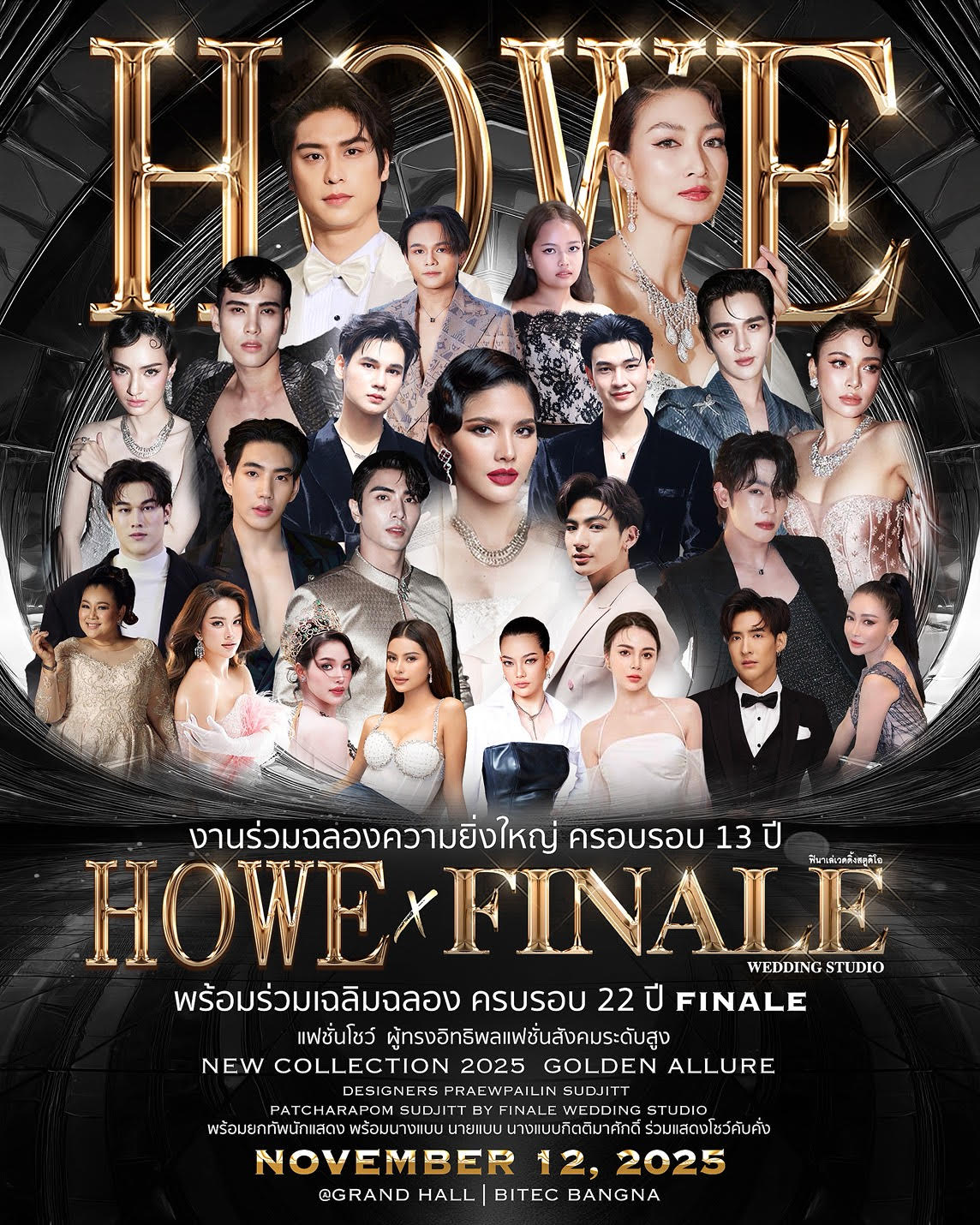 ร่วมฉลองความยิ่งใหญ่อีกครั้งกับงานประกาศผลรางวัล HOWE AWARDS 2025 ในวาระฉลองครบรอบ13 ปีของนิตยสาร HOWE ณ ห้องแกรนด์ ฮอลล์ ศูนย์การประชุมไบเทค บางนา โดยปีนี้ทาง HOWE ได้ร่วมจับมือกับฟินาเล่ เวดดิ้ง สตูดิโอ” ฉลองครบรอบ 22 ปี จัดแฟชั่นโชว์สุดอลังการ กับผลงานการออกแบบล่าสุด ของ 2 ทายาทรุ่นใหม่ พชรพรหม สุดจิตต์ @pxsj.20 และ แพรวไพลิน สุดจิตต์ @pailinq_ กับ Finale Wedding Studio New Collection 2025 Golden Allure พร้อมยกทัพนักแสดง นางแบบ นายแบบ เซเลบ และบุคคลที่มีชื่อเสียงแถวหน้าของเมืองไทยมาร่วมแสดงแฟชั่นโชว์ ชนิดจัดเต็ม ให้สมกับการเฉลิมฉลองครบรอบ 22 ปีของฟินาเล่ อาทิ แพนเค้ก เขมนิจ , ออกัส วชิรวิชญ์ ,กานต์ ณัฐชา, แก้ม ญาณิศา , แอนน่า กลึคส์ ,เซียน กิติภูมิ ,จิมมี่ จิรเมธ จู ,เบส นรเทพ,เอล่า นีรชา , ชาย สมชาย, ซัน ก้องภพ ,น้ำเหนือ วารี ,ยุ่น ภูษณุ , มีมี่ ฤทัยภัทร ,ภัค วรายุส์ ,จิก้า ณัฐนนท์ ,จอย กนกอร ,ตั้งโอ๋ ณัฐวัฒน์, เลม่อน วานิสา ,บูรพา น้อยศิริ โอ๊ต และงานประกาศรางวัล HOWE AWARDS รวมทั้งการก้าวขึ้นสู่ปีที่14 ของนิตยสาร HOWE ในครั้งนี้