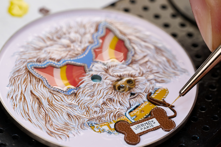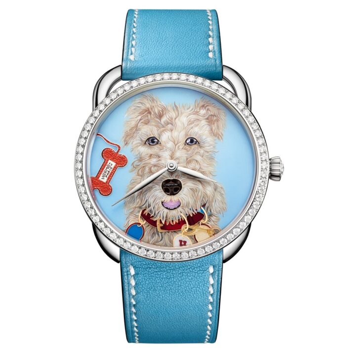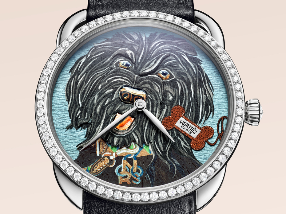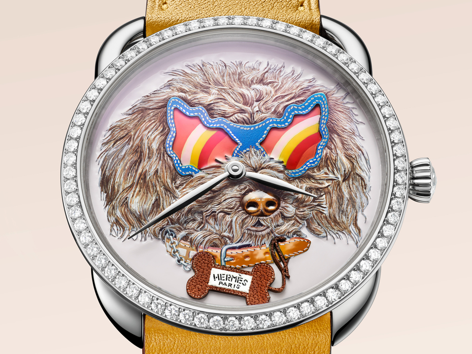 ผลงานการออกแบบโดยศิลปินนามว่า ลิซ สเตอร์ลิง (Liz Stirling) โดยเจ้าสุนัขสวมปลอกคอลวดลายประณีต ทั้งออร์สัน (Orson), เอมี (Amy) และทาโค (Taco) ต่างก็โพสท่าอย่างแสนซนบนศูนย์กลางของหน้าปัด พร้อมด้วยกระดูกหนังแท้ที่สะท้อนถึงงานหัตถศิลป์ด้านเครื่องหนังอันเป็นเอกลักษณ์ของแอร์เมส
