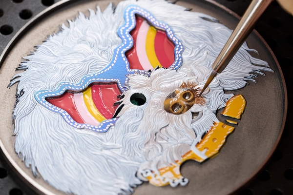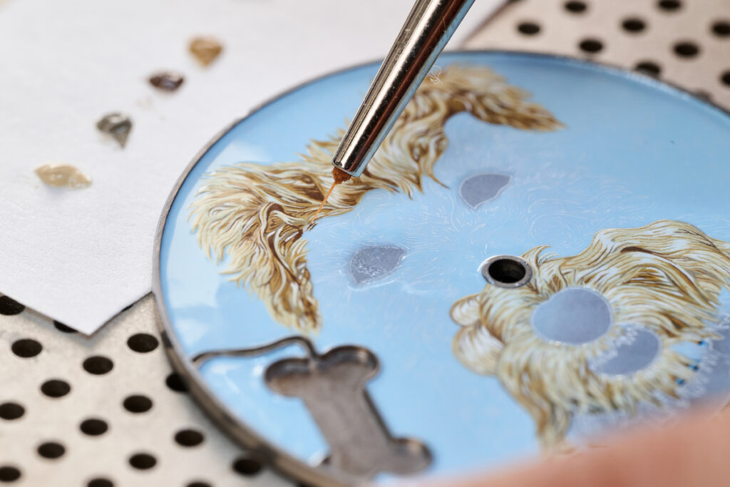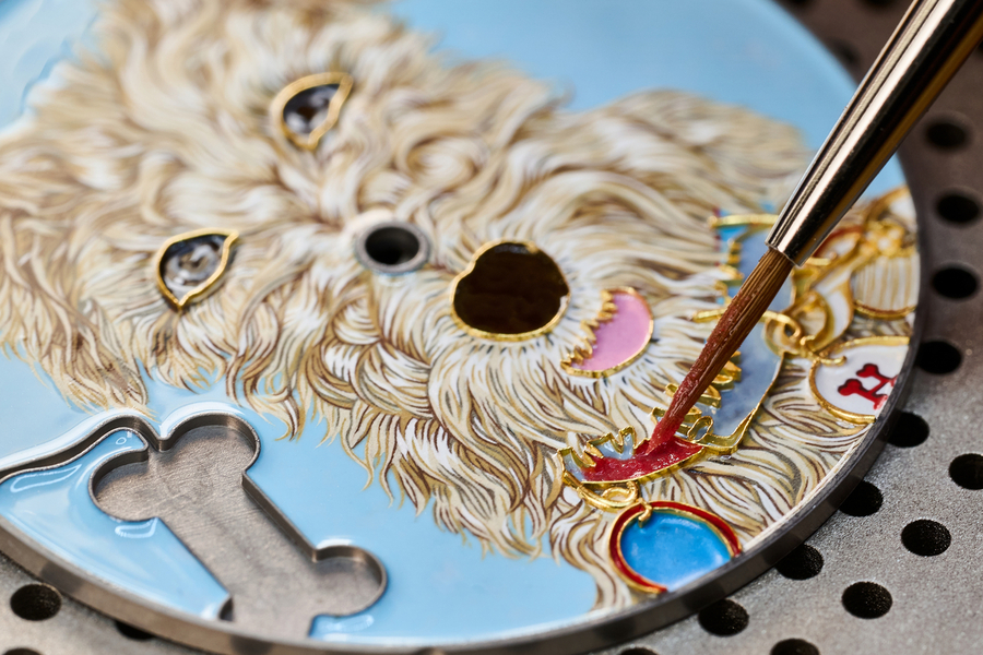 ถัดมาคือ ทาโค พร้อมแววตาเปื้อนรอยยิ้มที่รังสรรค์ขึ้นจากงานวาดภาพย่อส่วน และงานลงยาแบบคลัวซอนเน (cloisonné) โดยช่างศิลปินจะเริ่มต้นด้วยการระบายชั้นบาง ๆ ของสีลงยาโทนฟ้าลงบนหน้าปัด จากนั้นจึงวาดระบายด้วยมือบนขนสีขาวราวกับเสื้อโค้ทของเจ้าสุนัขเหนือพื้นหลังลายขด เทคนิคงานลงยาแบบคลัวซอนเนนี้ถูกใช้เพื่อย้ำถึงมิติแบบนูนต่ำของลายขนและความมีมิติลุ่มลึกของปลอกคอ โดยการใช้เส้นลวดทองที่มีความหนาแตกต่างกันมาวางเป็นโครงขอบให้กับพื้นที่ที่สำรองไว้สำหรับการตกแต่งด้วยงานลงยา ก่อนที่จะหลอมละลายเส้นลวดทองนี้เข้ากับงานลงยาในระหว่างกระบวนการเผา เทคนิคนี้ช่วยให้สามารถมอบมิติของการตกแต่งอันประณีตและรุ่มรวยไปด้วยสีสัน