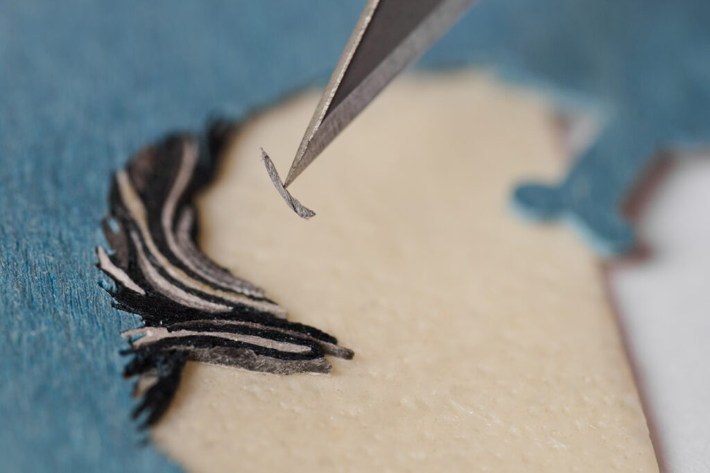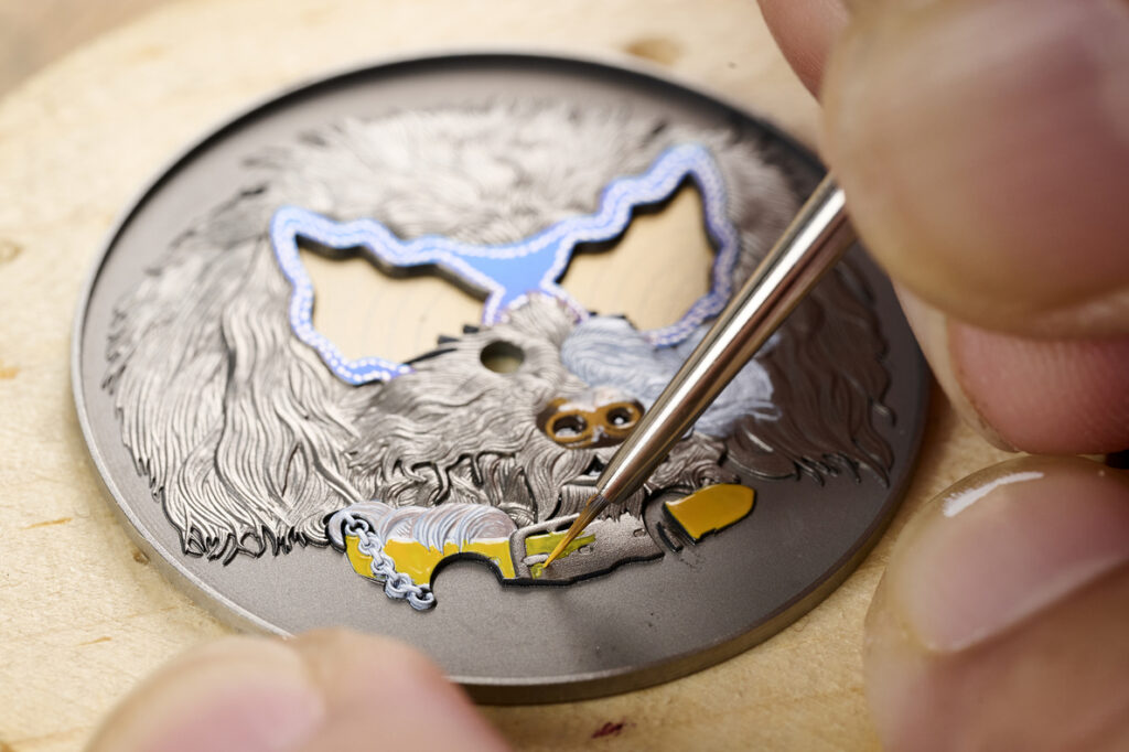 เริ่มต้นจากเจ้าสุนัข ออร์สัน ในโทนสีดำและขาวที่รังสรรค์ขึ้นจากงานต่อลายไม้ ราวกับการต่อภาพจิ๊กซอว์ ที่แต่ละรายละเอียดของเจ้าสุนัขตัวนี้ได้ถูกบรรจงตัดอย่างพิถีพิถันละเอียดอ่อน ก่อนจะนำมาประกอบและติดกาวกลายเป็นภาพอันสมบูรณ์แบบ ขณะที่ตะกร้อครอบปาก ดวงตา จมูก และลิ้น ผ่านการวาดภาพระบายสี เพื่อสร้างสรรค์แสงและมิติของภาพบนชิ้นไม้สำหรับต่อลายที่ได้มาจากไม้แปดชนิดแตกต่างกัน เพื่อรังสรรค์หน้าปัดที่ดูราวกับมีชีวิต