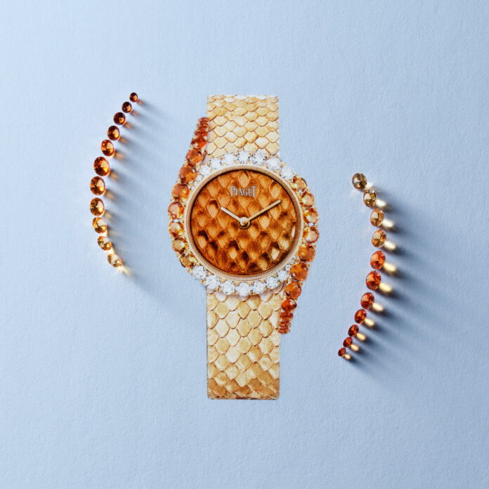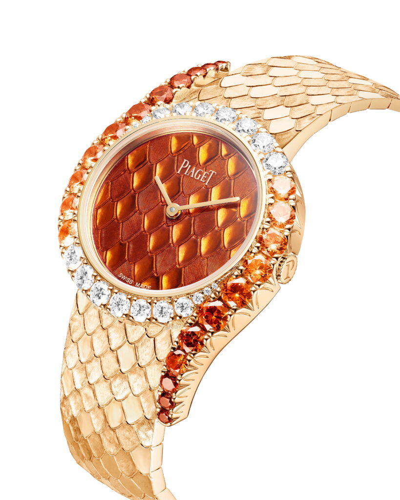 โมเดลแรกสะดุดตาด้วยพื้นหน้าปัดอีนาเมลสีส้มสดใส เคลือบบนทองคำที่ผสมผสานอัตลักษณ์ของ “เกล็ดงู” ผ่านเทคนิคการแกะสลักด้วยมือแบบดั้งเดิม ส่งมอบลวดลายคล้ายเกล็ดงูที่ซ้อนทับกันอย่างเป็นธรรมชาติ ขอบตัวเรือนโอบล้อมด้วยเพชรและสเปสซาร์ไทต์ไล่เฉดพระอาทิตย์อัสดง — ขณะที่อีกรุ่นเชิดชูเอกลักษณ์ของนาฬิกาเครื่องประดับในยุค 1960 ที่หยิบเอาเทคนิคการแกะสลัก Décor Palace มาเติมชีวิตชีวาให้กับโลหะมีค่า ก่อเกิดลวดลายทั้งบนสายและหน้าปัดที่เป็นเอกลักษณ์เฉพาะตัว  ประดับด้วยเพชรสีขาวไล่เฉดไปจนถึงสีน้ำตาลคอนยัคจำนวน 42 เม็ด ด้วยเทคนิค Serti Descendu สวยโดดเด่นเป็นเอกลักษณ์