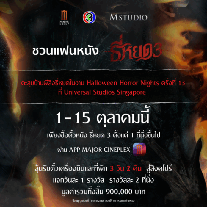 “M STUDIO” และ “ช่อง 3” ชวนแฟนหนังร่วมสัมผัสความหลอนขั้นสุดกับภาพยนตร์ “ธี่หยด 3” พร้อมกิจกรรมสุดพิเศษ ที่จะพาแฟน ๆ ลุ้นบินลัดฟ้าสู่สิงคโปร์ ตะลุยบ้านผีสิง “ธี่หยด” ในงาน Halloween Horror Nights ครั้งที่ 13 ณ Universal Studios Singapore