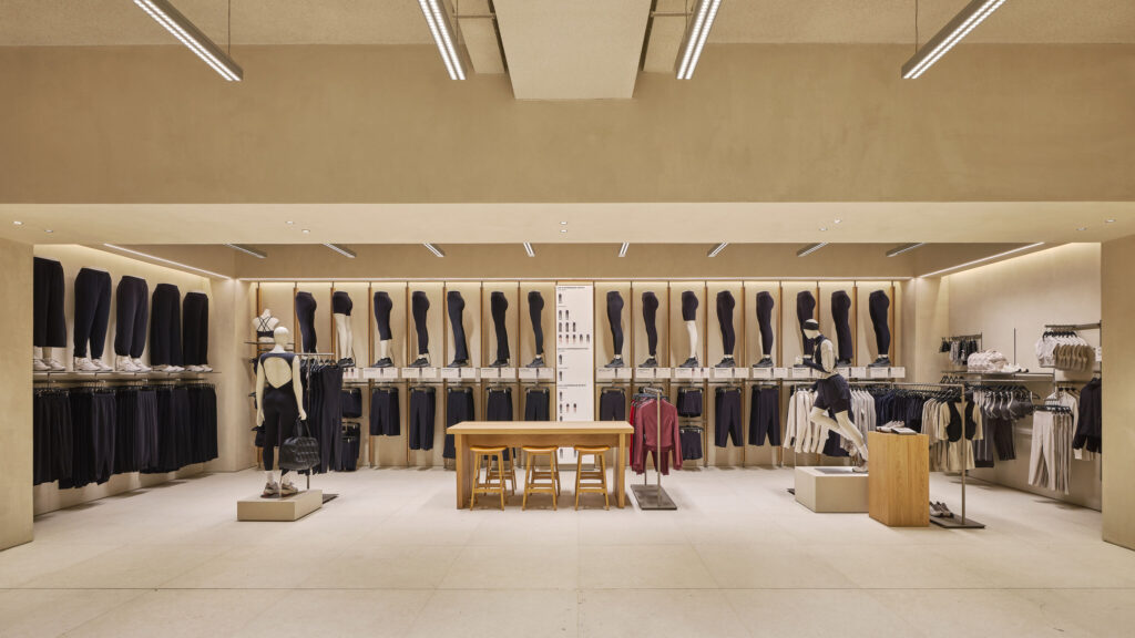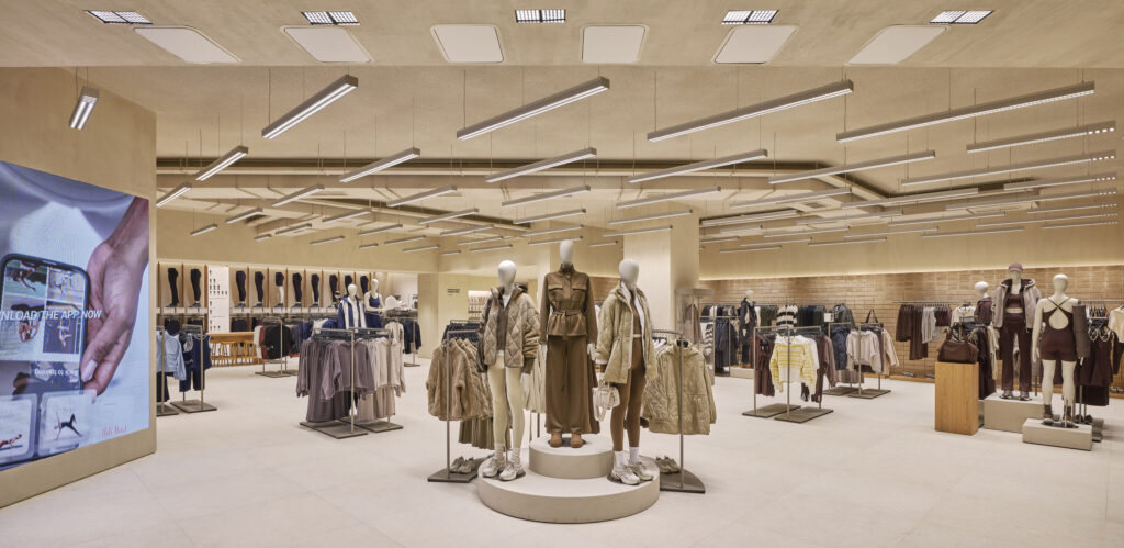 ด้านโครงสร้างสถาปัตยกรรมและวัสดุ ความอบอุ่น ผิวสัมผัสจากธรรมชาติ และแสงสว่าง คือองค์ประกอบสำคัญ ภายในร้านจึงเลือกใช้เป็นพื้นกระเบื้องพอร์ซเลนเพื่อให้เข้ากับวัสดุที่คัดสรรมาอย่างพิถีพิถัน โซนต้อนรับโดดเด่นด้วยผนัง earth-block งานแฮนด์คราฟต์ สะท้อนตัวตนของแบรนด์และชูภาพลักษณ์ความเป็นแบรนด์ผู้นำเทรนด์ Athleisure ตั้งแต่ก้าวแรกที่เข้าสู่ร้านและไม้โอ๊คธรรมชาติ ถูกนำมาใช้เป็นองค์ประกอบหลักโดยรอบพื้นที่ ซึ่งช่วยเพิ่มสัมผัสที่ให้ความอบอุ่น ขณะที่แสงสว่างมีบทบาทสำคัญในการออกแบบครั้งนี้ ด้วยการเดินระบบไฟเส้นแบบต่อเนื่องที่ออกแบบพิเศษ สร้างบรรยากาศร่วมสมัยที่อบอุ่นและเป็นมิตร พร้อมนำสายตาไปตลอดเส้นทางการช้อปปิ้งภายในร้าน