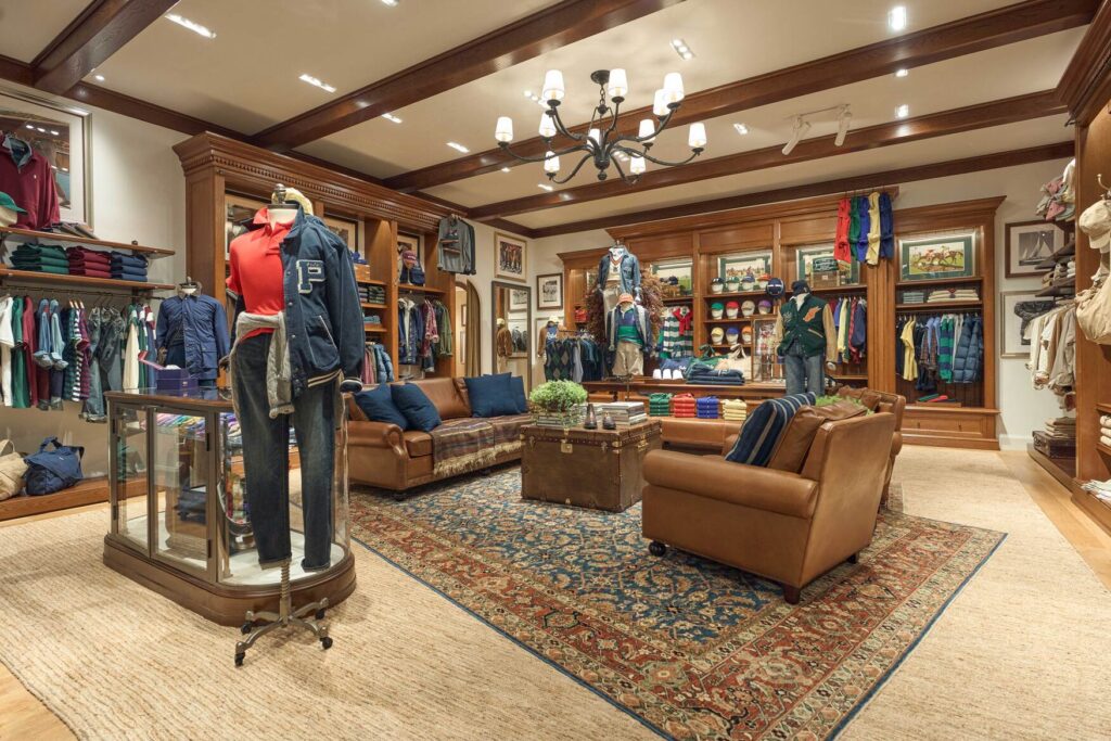 พื้นที่ภายในถูกออกแบบอย่างพิถีพิถันด้วยบรรยากาศที่อบอุ่นและคลาสสิก โดยใช้พื้นไม้โอ๊กกว้างและหินไลม์สโตน ผนังปูนฉาบทำมือ และเพดานคานไม้สูง เพื่อสร้างความหรูหราทว่าเป็นกันเอง รายละเอียดอย่างตู้หนังสือไม้โอ๊กแบบสั่งทำพิเศษ เฟอร์นิเจอร์ที่คัดสรรอย่างประณีต พรมซ้อนเลเยอร์ และงานศิลปะชิ้นเด่น ล้วนช่วยย้ำถึงความคลาสสิกและมรดกอันยาวนานของแบรนด์ พร้อมมอบประสบการณ์ช้อปปิ้งระดับพรีเมียมที่สะท้อนตัวตนของ Ralph Lauren อย่างแท้จริง