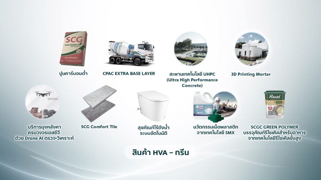 “นอกจากนี้ เรายังเร่งเพิ่มกำลังผลิตสินค้ากรีนและสินค้ามูลค่าเพิ่มสูง (High Value Added Products-HVA) ที่เป็นนวัตกรรมใหม่ๆ เช่น “ปูนคาร์บอนต่ำ” ซึ่งอยู่ระหว่างพัฒนาปูนรุ่นใหม่ Gen 3 ที่ลดคาร์บอนไดออกไซด์ได้ถึง 38% โดยจะปรับกำลังการผลิตที่ 2 ล้านตัน/ปีที่ จ.สระบุรี ภายใน 2 ปีข้างหน้า ส่วน CPAC Extra Base Layer นวัตกรรมซ่อม-สร้างถนนที่คงตัวทนทาน ลดการยุบตัวจากการกัดเซาะน้ำ สะพาน UHPC (Ultra High Performance Concrete) สมรรถนะสูง ลดเวลาก่อสร้างได้ถึง 50% เทคโนโลยีการขึ้นรูปอาคารก่อสร้างที่มีดีไซน์ซับซ้อน หรือ 3D Printing Mortar จะขยายตลาดไปญี่ปุ่น ซาอุดิอาระเบีย และมาเลเซีย รวมทั้ง ยกระดับ Roof Installation ซึ่งเป็นบริการมุงหลังคาครบวงจรเของอสซีจี ด้วย Drone AI บริการตรวจหารอยรั่วหลังคาและวิเคราะห์โครงสร้างแบบ 3 มิติ ช่วยให้ซ่อมแซมรวดเร็ว ปลอดภัย และแม่นยำยิ่งขึ้น หรือจะเป็น SCG Comfort Tile กระเบื้องซีเมนต์ปูพื้นรายแรกในไทยที่ลดความร้อนสะสมได้ 3–7 องศาเซลเซียส ด้วย HeatSync Technology ทำให้พื้นเย็น สุขภัณฑ์ไร้ถังประหยัดน้ำ DUACT และแบบ “เคลือบจากเปลือกไข่–หอย” ลดการปล่อยก๊าซเรือนกระจก นวัตกรรมเม็ดพลาสติกจากเทคโนโลยี SMX ช่วยลดความหนาของผลิตภัณฑ์ลงโดยยังคงความแข็งแรง และเรายังพัฒนาเป็นสินค้าหลากหลาย เช่น ท่ออุตสาหกรรมสำหรับเหมืองแร่ขนาดใหญ่ ฝาขวดน้ำอัดลม ถังบรรจุสารเคมี และบรรจุภัณฑ์สินค้าอุปโภคบริโภค นวัตกรรมพลาสติกรีไซเคิล ทั้งเทคโนโลยีรีไซเคิลเชิงกล และเทคโนโลยีรีไซเคิลขั้นสูง ซึ่งใช้ผลิตเป็นบรรจุภัณฑ์ Food Grade ปลอดภัย ผ่านการรับรองมาตรฐาน ISCC PLUS ซึ่งทุกผลิตภัณฑ์จะครอบคลุมทุกห่วงโซ่อุปทานครับ”
