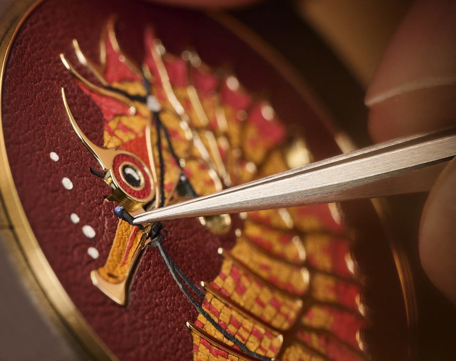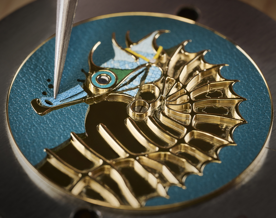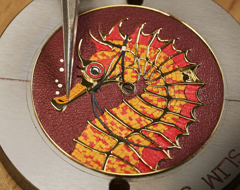 เพื่อถ่ายทอดรูปร่างโค้งของม้าทะเลมาสู่ขนาดย่อส่วนของนาฬิกาข้อมือ ช่างแกะสลักได้เริ่มต้นทำงานโดยการวาดเค้าโครงร่าง และรูปทรงของเจ้าม้าทะเล โดยอาศัยการใช้เครื่องมือที่มีความหลากหลายแตกต่างกัน หลังจากงานแกะสลักแล้ว จึงเข้าสู่ขั้นตอนของการต่อลายหนังอันเชี่ยวชาญเฉพาะ ซึ่งต้องใช้หนังในหลากหลายโทนสีและผ่านการเฉือนให้บางเหลือความหนาเพียง 0.5 มม. ก่อนที่จะบรรจงตัดเป็นชิ้นเล็ก ๆ อย่างพิถีพิถันละเอียดอ่อน เพื่อนำมาใช้สร้างสรรค์แต่ละองค์ประกอบของงานออกแบบขึ้นใหม่ โดยชิ้นหนังเล็ก ๆ เหล่านี้จะถูกประกอบทีละชิ้น ทีละชิ้นลงบนหน้าปัด และรังสรรค์กลายเป็นภาพของม้าทะเลที่ดูราวกับมีชีวิตด้วยฝีมือของศิลปินช่างทั้งหมด