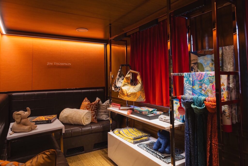 อีกหนึ่งไฮไลต์ที่พลาดไม่ได้คือโชว์รูม จิม ทอมป์สัน บนขบวนรถไฟแห่งแรกของแบรนด์ ที่นำเสนอสินค้าผ้าไหมสุดไอคอนิก รวมไปถึงคอลเลกชันแฟชั่นและไลฟ์สไตล์ที่คัดสรรมาเป็นพิเศษ พร้อมให้ทุกคนช้อปสะดวกผ่านการสแกนคิวอาร์โค้ดเพื่อสั่งซื้อออนไลน์ และจัดส่งตรงถึงที่บ้านเมื่อสิ้นสุดทริป