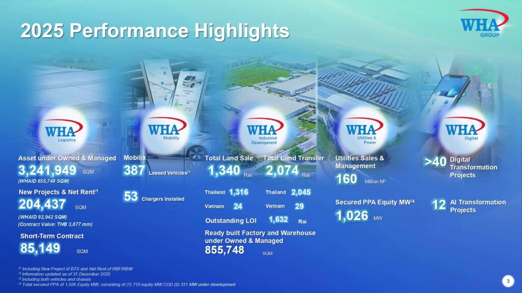ธุรกิจโมบิลิตี้ ภายใต้แบรนด์ โมบิลิกส์ (Mobilix) – ในปี 2568 ประสบความสำเร็จในการให้บริการเช่ารถยนต์ไฟฟ้าสะสมรวม 387 คัน สำหรับกลยุทธ์ปี 2569 เน้นสร้างระบบนิเวศยานยนต์ไฟฟ้า พร้อมการให้บริการแบบครบวงจร ครอบคลุมตั้งแต่ การให้เช่ารถยนต์ไฟฟ้า บริการเครือข่ายสถานีชาร์จ และ Mobilix Software Solution ซึ่งเป็นแพลตฟอร์มดิจิทัลกรีนโลจิสติกส์อัจฉริยะสำหรับจัดการยานยนต์ไฟฟ้าและแบตเตอรี่ โดยปี 2569 บริษัทตั้งเป้าให้บริการเช่ารถ EV สะสม 637 คัน ธุรกิจนิคมอุตสาหกรรม – บริษัทบริหารนิคมอุตสาหกรรม 17 แห่งในประเทศไทยและเวียดนาม บนพื้นที่รวม 88,900 ไร่ ในปี 2568 มียอดขายที่ดิน 1,340  ไร่ ยอดโอน 2,074 ไร่ และBacklog รอโอน 770 ไร่ พร้อมยอด LOI/MOU รอเซ็นสัญญา 1,632 ไร่ และล่าสุด ในไตรมาส 1/2569 สัญญา LOI/MOU ได้แปลงเป็นสัญญาซื้อขายเรียบร้อยแล้วกับลูกค้ารายหนึ่ง พื้นที่กว่า 900 ไร่ ปี 2569 เดินหน้าพัฒนาโครงการนิคมอุตสาหกรรมเชิงนิเวศอัจฉริยะ โดยเฉพาะ WHA Eastern Seaboard Industrial Estate 5 (WHA ESIE5) พื้นที่ 6,490 ไร่ ซึ่งคาดว่าเริ่มโอนได้ในไตรมาส 1/2569 ด้านประเทศเวียดนาม บริษัทมุ่งขยายเขตอุตสาหกรรมเพิ่มในจังหวัดเหงะอานและทัญฮว้า โดยเฉพาะ WHA Smart Technology Industrial Zone 1 and 2 – Thanh Hoa พื้นที่ 2,210 ไร่ รวมถึงจังหวัดใหม่อย่างฮึงเอียนและดานัง เพื่อรองรับการย้ายฐานการผลิต บริษัทตั้งเป้ายอดขายที่ดินปี 2569 รวม 2,500 ไร่ แบ่งเป็นไทย 2,300 ไร่ และเวียดนาม 200 ไร่